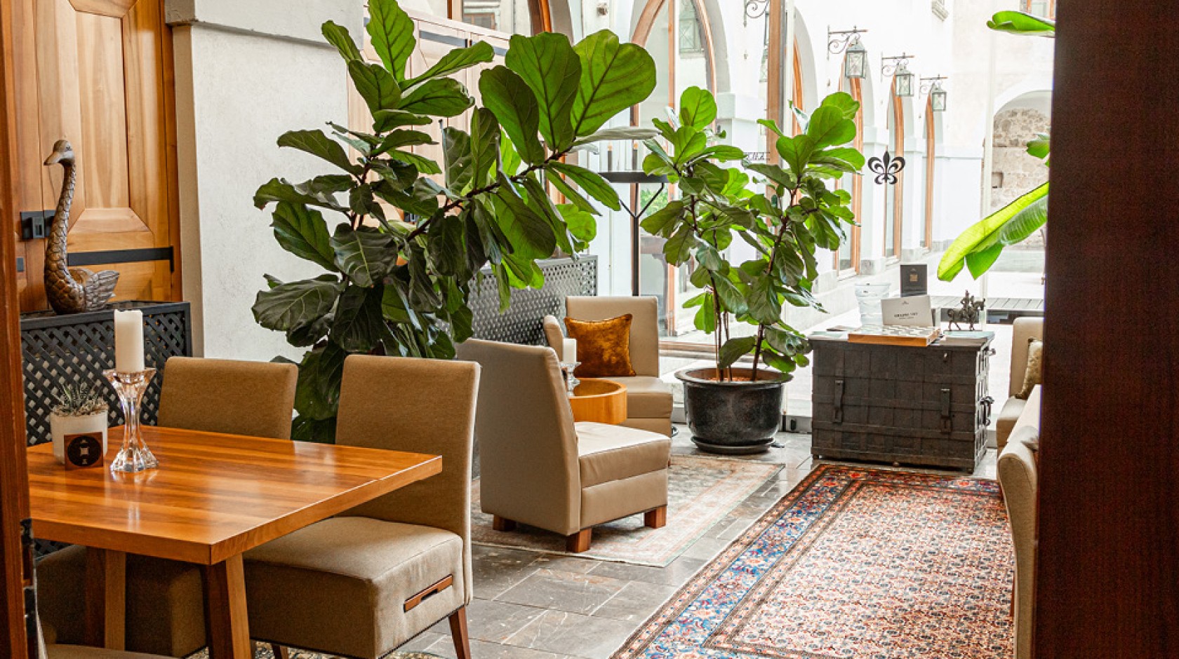 In essa troviamo idee per la composizione dei piatti e nei piatti ricreiamo l'armonia e la bellezza del nostro ambiente. Siamo inoltre orgogliosi dell'ambiente e dell'atmosfera speciale del ristorante, sia nel ristorante centrale, nella Sala della Caccia con camino e nel caffè, sia sulla terrazza all'interno delle mura del castello.
